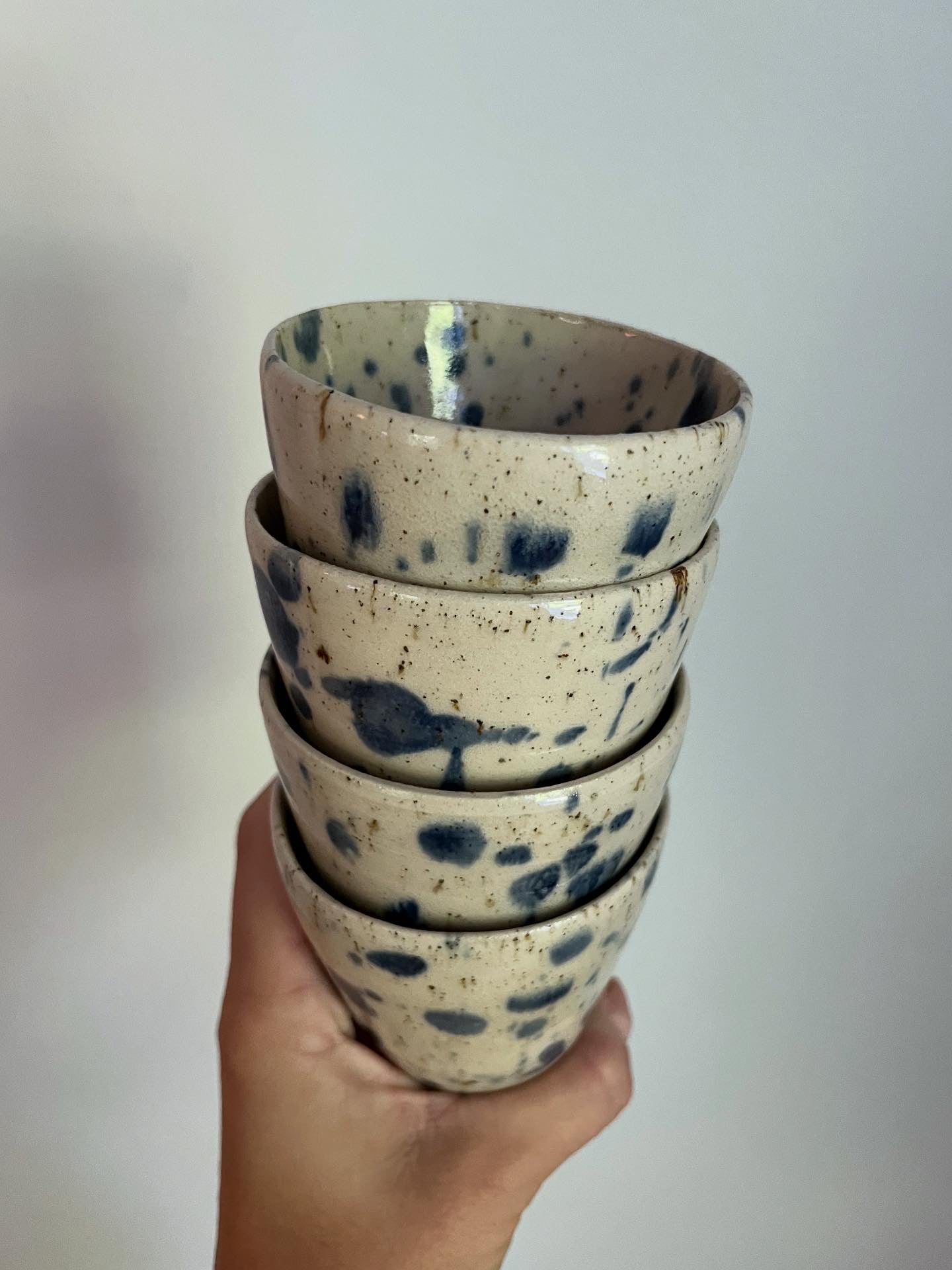 Kopp utan öra i stengodslera med transparent glasyr och blå prickar.