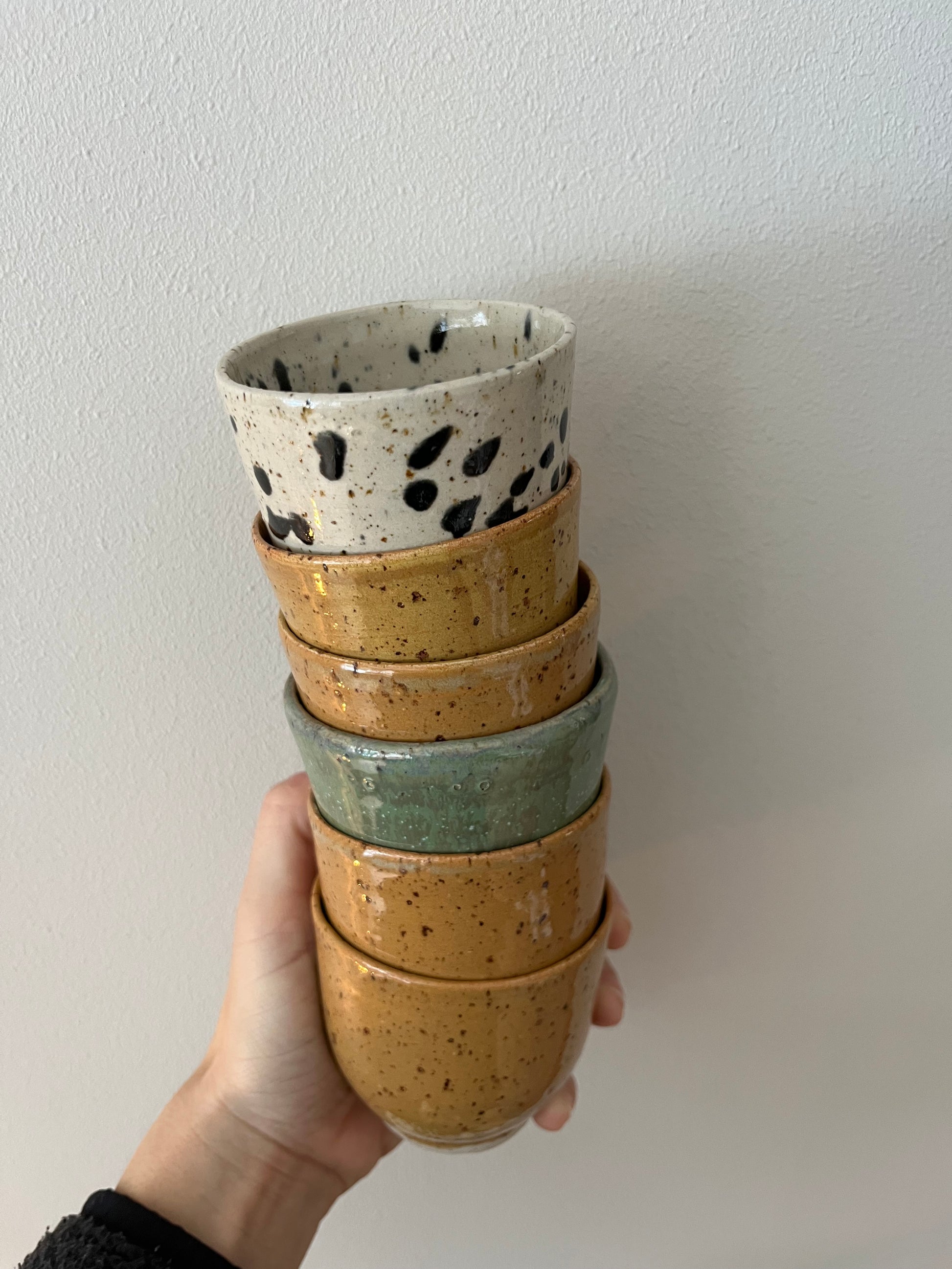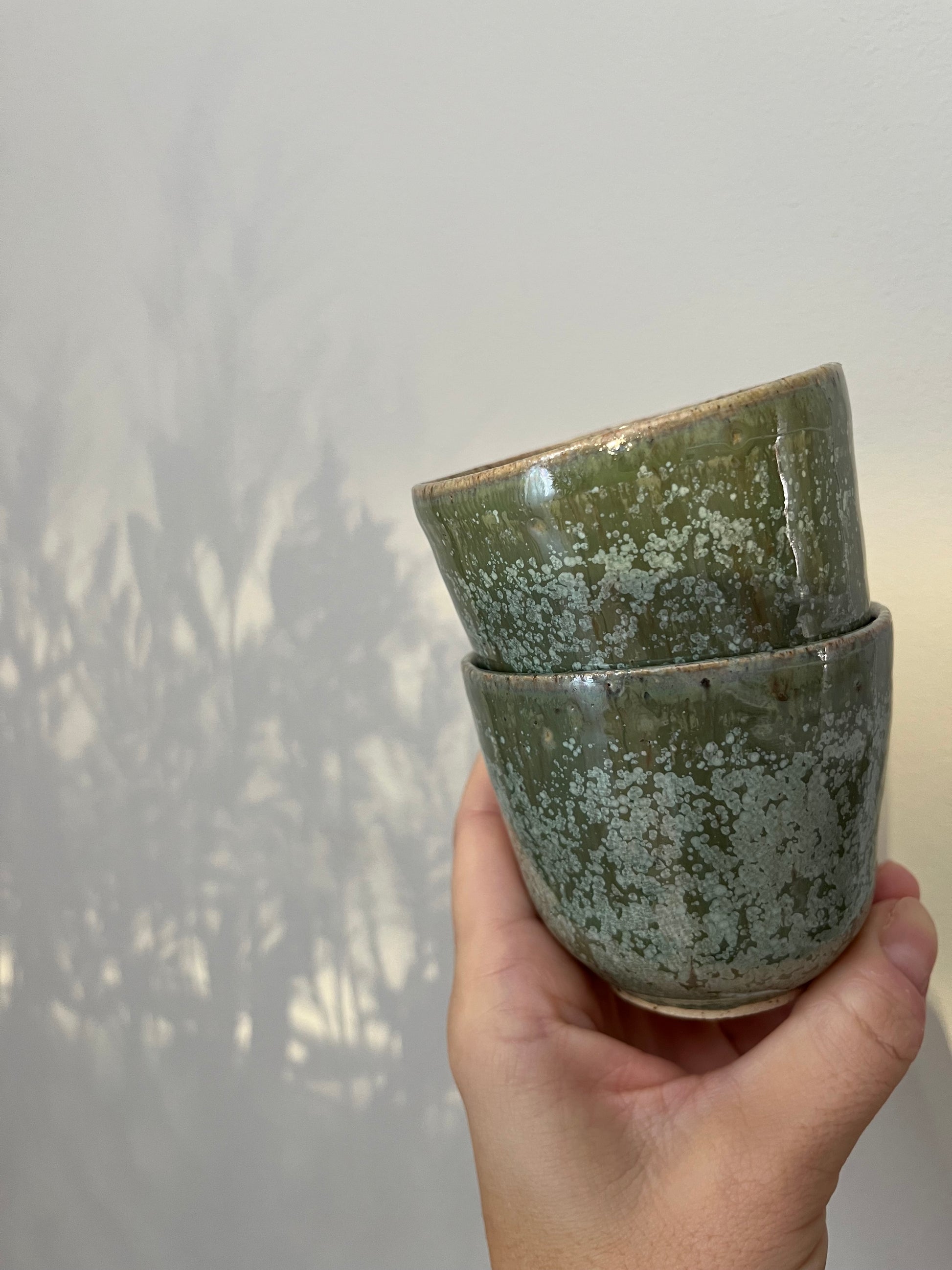 Kopp utan öra i stengodslera med grön glasyr. Perfekt för en espresso, macchiato eller en liten kaffe.
