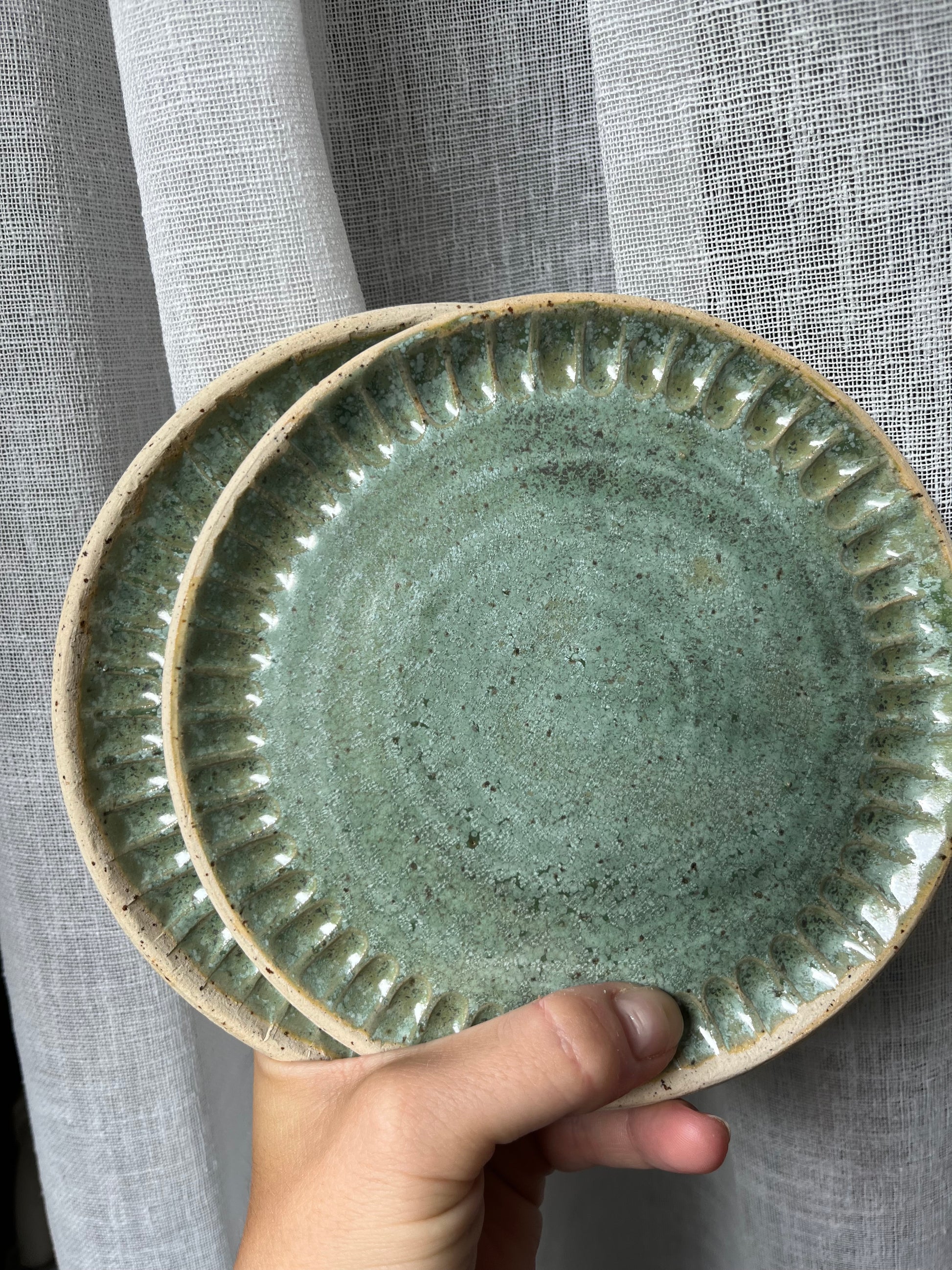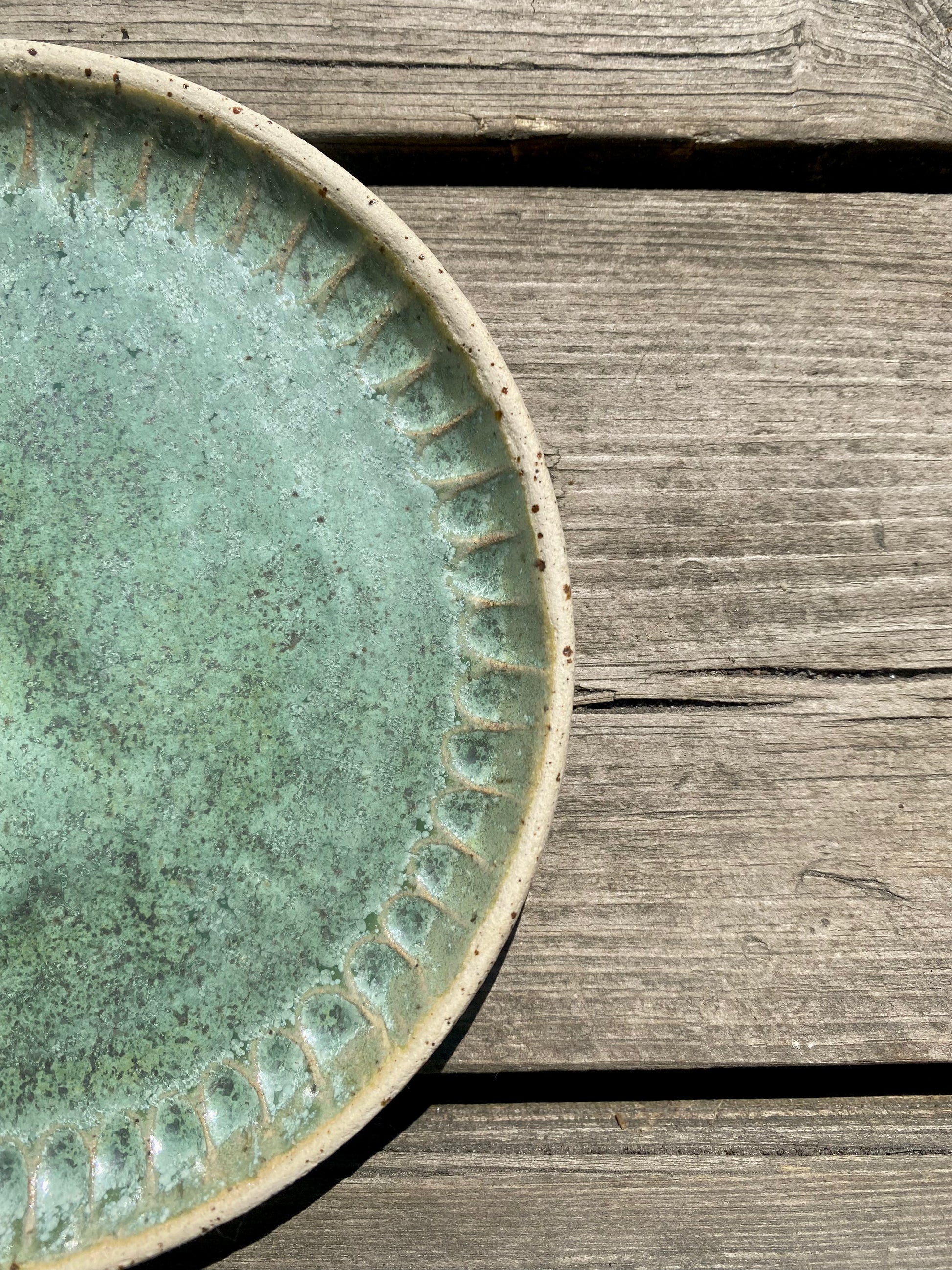 Litet fat i stengodslera med grön glasyr och mönstrad kant.