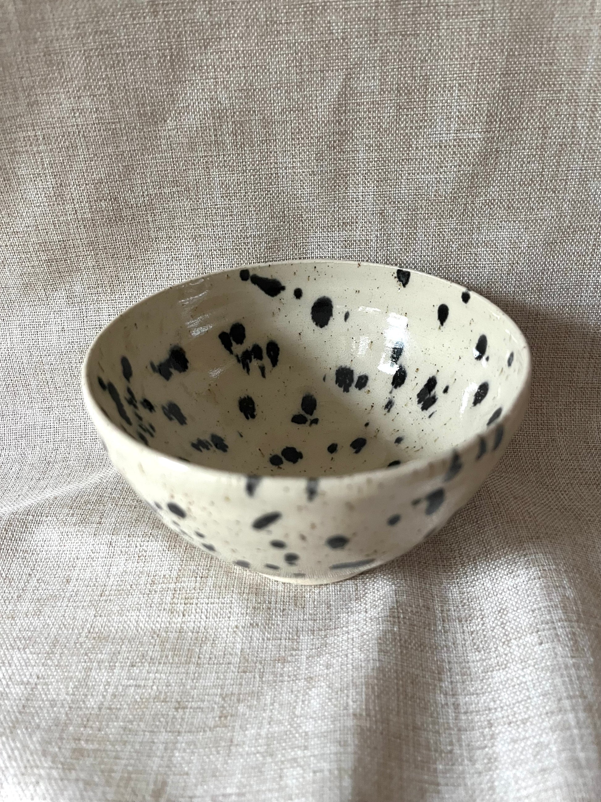 Skål i stengodslera med transparent glasyr och svarta prickar.